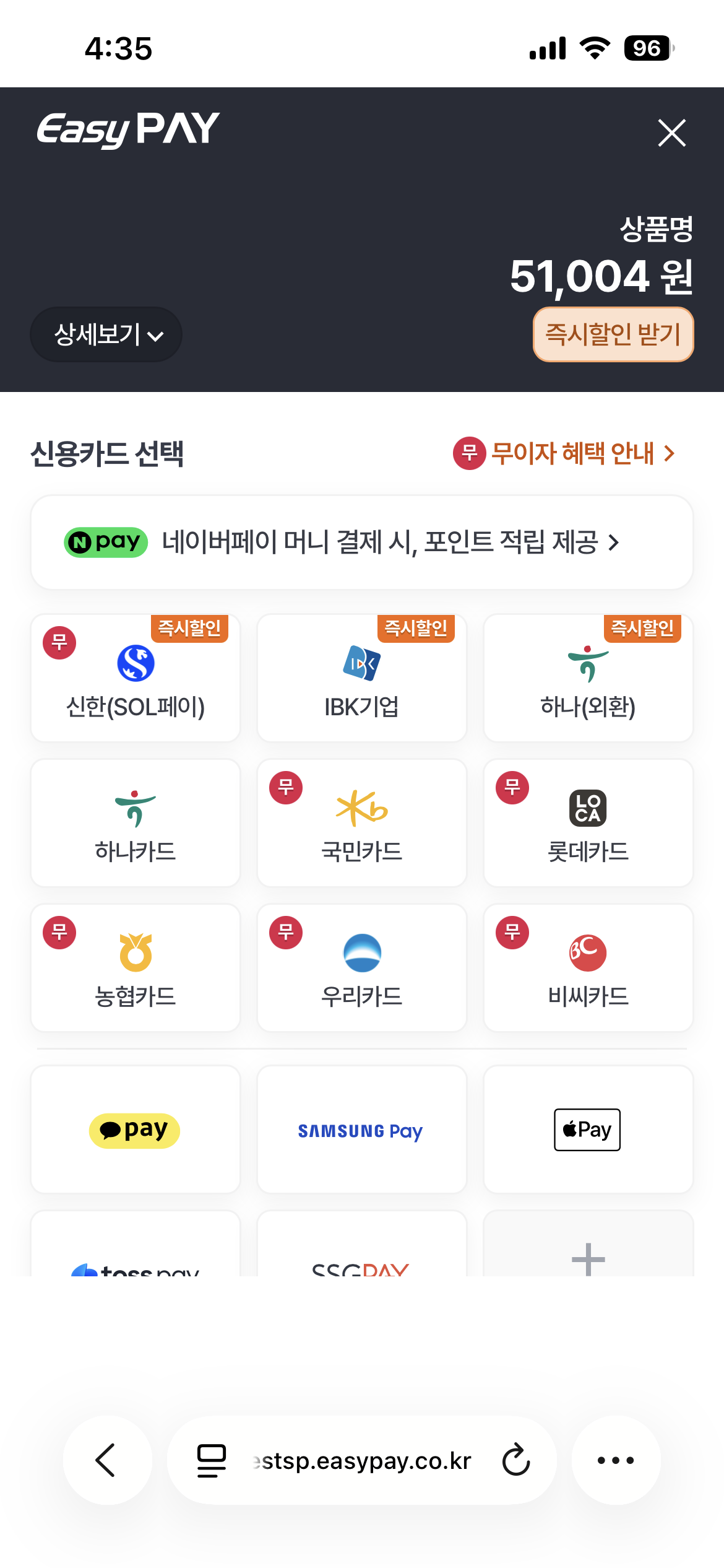 - 다양한 결제 수단: 신용카드, 네이버페이, 카카오페이 등 다양한 결제 수단을 한 번에 연동할 수 있습니다.